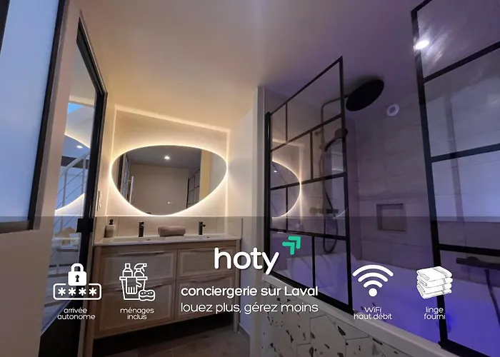 Cocon Mayennais - Loft Balneo Laval - Loveroom ferielejlighed ligger 2 km fra Basilique Notre-Dame d'Avesnières og tilbyder indkvartering med Wi-Fi i hele ejendommen. Lejlighed består af 1 soveværelser, 1 badeværelser og også et fuldt udstyret køkken.